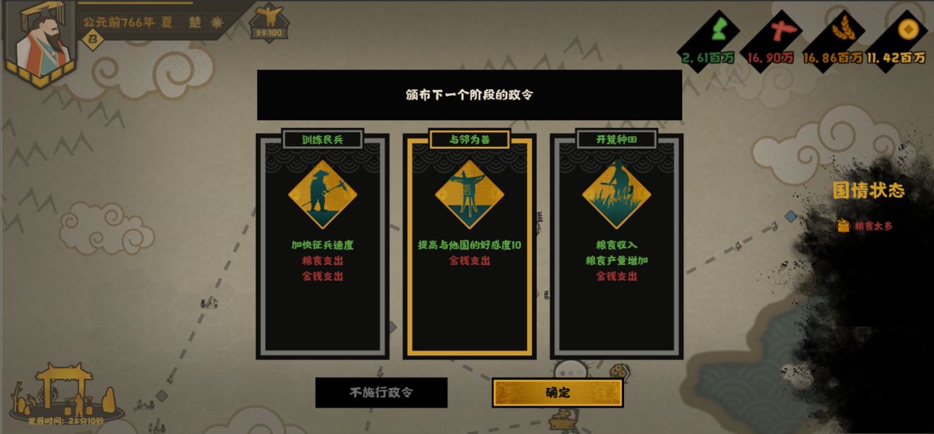 可以在每隔一段时间召开的朝会中,制订下一个阶段的国家方针,比如发展、外交、进攻、征兵、裁军等等,配合国家的其他行为,才能攻无不克,战无不胜。而且,我还为每个国家设计了自己独特的方针,来让每个国家都更加独特。